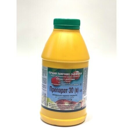 Після знищення яєць та личинок шкідників ранньою весною рослина прокидається і розвивається на повну силу. Влітку зі знищених личинок та яєць шкідники не з'являться, але необхідно стежити за їх можливою появою через різні причини: особливі кліматичні умови, міграція з боку, переліт з сусідніх ділянок, а такі шкідники, як попелиця, мають у своєму розвитку 10-12 поколінь за сезон. Призначення Препарат 30В: ранньовесняна обробка від 4°С до розпускання нирок; найкращий ефект це обробка у фазі набряклих бруньок; осіння обробка при температурі не нижче 4°С (цілодобово) після опадання листя; літня обробка по виходу бродяжок 2 та 3 покоління (за прогнозом станцій захисту рослин). Обробляти потрібно ретельно, не залишаючи пропущених ділянок. Препарат 30В є гарним прилипачем, змішується з більшістю порошкоподібних та рідких препаратів: органічними інсектицидами та фунгіцидами. Препарат 30 В запатентовано. Остерігайтеся підробок, як правило, вони виявляються токсичними, канцерогенними, фототоксичними та малоефективними, що може завдати шкоди рослинам і вашому здоров'ю.