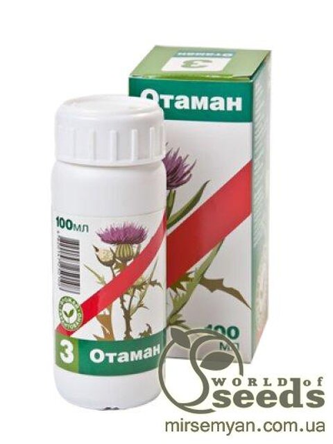 Гербіцид Отаман – системний гербіцид-десикант суцільної дії. Діюча речовина – ізопропіламінна сіль гліфосату 480 г/л, у кислотному еквіваленті 360 г/л. Норма витрати препарату – 2,0-6,0 л/га. Механізм дії Препарат пригнічує білковий синтез у клітинах рослин, внаслідок чого відбувається інгібування синтезу хлорофілу з подальшим відмиранням рослин. Завдяки сучасній поверхнево-активній речовині гербіцид ОТАМАН швидко та ефективно проникає через листя та інші зелені частини рослини. розноситься по всіх органах до кореневої системи. Повна загибель настає через 10-12 днів, залежно від погодних умов, виду, стадії розвитку бур'янів. Спочатку спостерігається пожовтіння рослин, потім листя в'яне. Надійність препарату проявляється у вигляді стабільного гербіцидного ефекту при використанні для приготування розчину води з широким інтервалом жорсткості. Препарат характеризується низьким рівнем піноутворюючої здатності під час приготування робочого розчину. Ця властивість є дуже актуальною при використанні препарату методом малооб'ємного обприскування, особливо під час авіаційного внесення. загальні рекомендації Для досягнення найкращих результатів використовуйте препарат, коли бур'яни перебувають у стадії активного зростання за сприятливих погодних умов. Оптимальна для обробки фаза розвитку бур'янів: багаторічні злакові - 4-5 листя (10-15 см), багаторічні злакові - розетка 10-20 см, однорічні злакові - при довжині листя мінімум 5 см, однорічні злакові - 2-3-х справжніх листків . Застосовувати при сухій. безвітряної погоди, не пізніше ніж за шість годин до випадання дощу. Під час обприскування не допускати попадання гербіциду на листя культурних рослин, дерев та чагарників. Не застосовувати гербіцид ОТАМАН при температурі повітря нижче 10°С при температурі повітря вище 25°С. Гербіцид можна змішувати з іншими загальновживаними пестицидами на відповідних культурах. Однак у будь-якому разі необхідно перевіряти препарати на сумісність. Для посилення гербіцидної дії на менш чутливі до гліфосату бур'янів, у тому числі багаторічні злакові застосовують бакові суміші: Отаман (3-4 л/га) + Альфа-Дікамба (0,3-0,5 л/га); Отаман (3-4 л/га) + Альфа-Ефір (0,6-0,8 л/га). Норма витрати робочої рідини 150-250 л/га. Докладніше: дерев та чагарників. Не застосовувати гербіцид ОТАМАН при температурі повітря нижче 10°С при температурі повітря вище 25°С. Гербіцид можна змішувати з іншими загальновживаними пестицидами на відповідних культурах. Однак у будь-якому разі необхідно перевіряти препарати на сумісність. Для посилення гербіцидної дії на менш чутливі до гліфосату бур'янів, у тому числі багаторічні злакові застосовують бакові суміші: Отаман (3-4 л/га) + Альфа-Дікамба (0,3-0,5 л/га); Отаман (3-4 л/га) + Альфа-Ефір (0,6-0,8 л/га). Норма витрати робочої рідини 150-250 л/га. Докладніше: дерев та чагарників. Не застосовувати гербіцид ОТАМАН при температурі повітря нижче 10°С при температурі повітря вище 25°С. Гербіцид можна змішувати з іншими загальновживаними пестицидами на відповідних культурах. Однак у будь-якому разі необхідно перевіряти препарати на сумісність. Для посилення гербіцидної дії на менш чутливі до гліфосату бур'янів, у тому числі багаторічні злакові застосовують бакові суміші: Отаман (3-4 л/га) + Альфа-Дікамба (0,3-0,5 л/га); Отаман (3-4 л/га) + Альфа-Ефір (0,6-0,8 л/га). Норма витрати робочої рідини 150-25