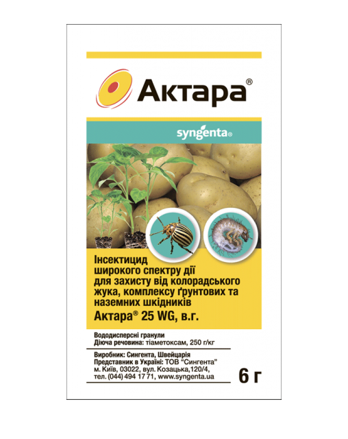 Актара® — системний інсектицид нового покоління, має високу ефективність і швидко діє (протягом 15 хвилин) незалежно від погодних умов. Актара® гарантовано захищає рослини протягом 24 днів, що на 6–7 днів довше, ніж інші інсектициди. Актара® захищає також молоді пагони, які з’явилися після обробки, завдяки високій розчинності й рухливості діючої речовини в рослині. Діюча речовина препарату рухається по рослині тільки вгору (апікально) по ксилемі і не накопичується в бульбах, овочах та плодах, які формуються з відливом пластичних мас по флоемі. Препарат належить до класу малотоксичних речовин (ЛД50>5000 мг/кг).