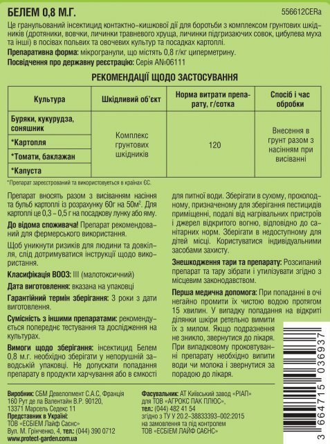 Protect Garden (Bayer) germany Тип ІнсектецидиУпаковка МіниВиробник Protect Garden (Bayer) BayerДія Грунтова діяБелем - Це гранульований інсектицид контактно-кишкової дії для боротьби з комплексом шкідників (дротяника, дзиги, личинки травневого жука, личинки підгризаючих совок, цибулева муха, та інші) у посівах польових та овочевих культур та посадках картоплі Норма вносять разом з вииванням насіння та бульб картоплі з розрахунку 60 г на 50 м2. Для картоплі це 0,3-0,5 г на посадкову лунку або яму. Група: Інсектицид Діюча речовина: циперметрин (0,8 г/кг) Країна виробництва: Франція Упаковка: 60 г Механізм дії пов'язаний з блокуванням ацетилхолінових рецепторів що призводить до функціональних змін постсинаптичної нейрональної мембрани та блокуванням нервово-м'язової передачі. Спеціально розроблена формуляція - мікрогранули, яка дозволяє рівномірну локалізацію необхідної кількості препарату у зоні залягання насіння для надійного знищення шкідників. Тривалість захисної дії залежно від виду шкідника та погодних умов становить 24-28 діб.