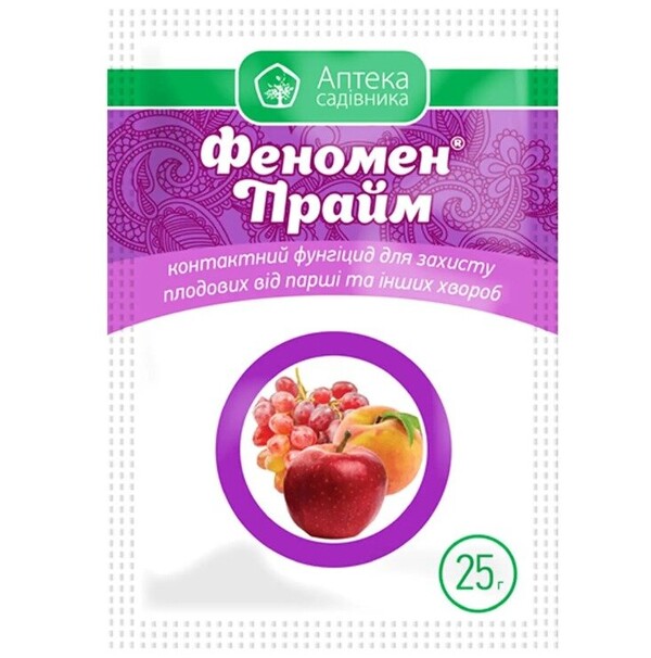 Фунгіцид "Феномен Прайм" – це ефективний засіб для профілактичного захисту садових культур від грибкових хвороб. Він містить каптан (780 г/кг), що належить до хімічної групи фталімідів і діє шляхом створення на поверхні рослин стійкого захисного бар’єру. Після обробки препарат міцно фіксується на листі, стеблах і плодах, не проникаючи всередину рослинних тканин. Це дозволяє блокувати розвиток патогенів ще до їхнього проникнення в рослину.