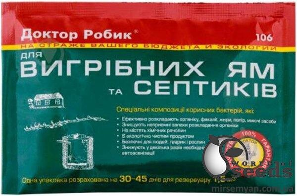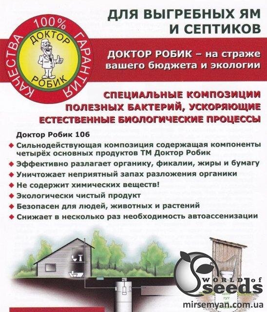Лікар Робік- спеціальні композиції корисних бактерій, що прискорюють природні біологічні процеси. Вся бактеріальна продукція Доктор Робік призначена для очищення та профілактики каналізаційних систем: септичних систем (септик) і вигрібних ям. Ці бактерії розроблені вченими для утилізації навіть тих речовин, які важко піддаються розкладанню і не руйнуються біологічними речовинами. протягом місяця знизить необхідність відкачування, збільшить утилізацію твердих речовин, очистить і усуне запахи. n -ефективно розкладає органіку, фекалії, жири, папір і т.д., - знищує неприємні запахи розкладання органіки - не містить хімічних речовин, - екологічно чистий продукт, - 092;n-безпечний для людей, тварин і рослин,