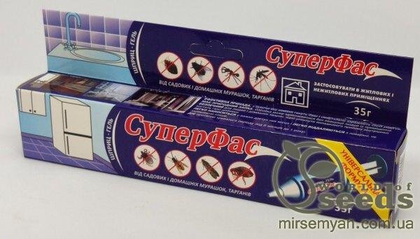 Шприц-гель Супер Фас – високоефективний інсектицидний засіб для знищення тарганів, мурах та інших побутових комах. Супер Фас призначений для використання у будь-яких приміщеннях, у тому числі й у місцях приготування їжі. У складі препарату є інсектицидна речовина, а також харчові добавки та ароматизатори для залучення комах. Принцип дії. Комахи, залучені запахом гелю, поїдають його та йдуть у гніздо. Під час поїдання, гель налипає на лапки комахи, таким чином, тарган (мураха) поширює інсектицид усередині колонії. Після того, як отруєна комаха гине, вона стає отруєною їжею для своїх одноплемінників. Загибель комахи настає через 1-2 дні, що не викликає підозри у родичів щодо приманки. Переваги шприц-геля Супер Фас: має пролонговану дію - 1, 5-2 місяці, не викликає резистентності у комах, засіб простий у застосуванні та не вимагає спеціальних заходів захисту під час обробки приміщень, інсектицид малотоксичний, не випаровується та не становить небезпеки для людей та домашніх тварин. Застосування. Зняти зі шприца ковпачок і натискаючи на поршень, наносити гель на поверхні (переривчастими лініями або краплями, на відстані 4-6 см один від одного). Обробку поверхонь проводять у місцях пересування та найбільшого скупчення комах (вздовж плінтусів та порогів, біля сміттєзбірників та каналізаційних систем, під кухонними меблями, холодильником та біля опалювальних труб). Через 1,5-2 місяці рекомендується провести профілактичну обробку поверхонь з метою захисту приміщення від комах, що знову прийшли. Орієнтовна витрата - 35 г на 40 м кв.