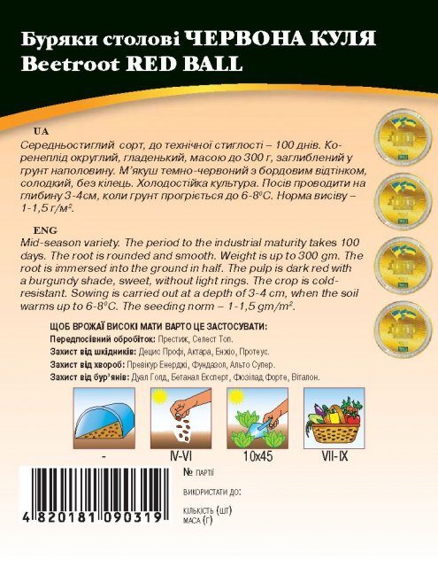 Середньостиглий, багаторостковий сорт, до технічної стиглості – 100 днів. Коренеплід округлий і округло-овальний, гладкий, масою до 300 г, занурений у ґрунт наполовину. М'якуш темно-червоний з бордовим відтінком, солодкий, без кілець. Універсальне призначення. Холодостійка культура. Добре росте на удобрених, родючих, легких ґрунтах. Посів проводити на глибину 3-4 см, коли ґрунт прогріється до 6-8ºС. Норма висіву – 1-1,5 г/м2. Особливо потребує вологи в період проростання насіння, утворення та зростання коренеплодів.