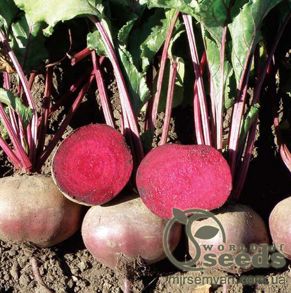 Корнеплоди< /em> - округлі, темно-червоні, без білих кілець, місце прикріплення бадилля дуже маленьке.