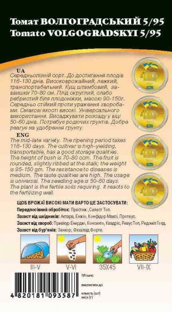 Середньопізній сорт. До дозрівання плодів – 116-130 днів. Високоврожайний, лежкий, транспортабельний. Кущ штамбовий, середньогілястий, заввишки 70-80 см. Плід округлий, слабо ребристі у плодоніжки, масою 90-150 г. Середовище нестійке проти ураження хворобами. Смакові якості високі. Універсальне використання. Культура тепло- та світлолюбне. Вирощувати розсадою або посівом насіння в ґрунт. Насіння перед посівом краще обробляти 1% розчином марганцевокислого калію. Висівати насіння на глибину 1-1,5 см. Висаджувати розсаду віком 50-60 днів. Вимагає легких родючих ґрунтів. Добре реагує на добрива ґрунту.