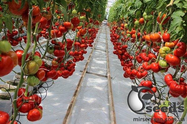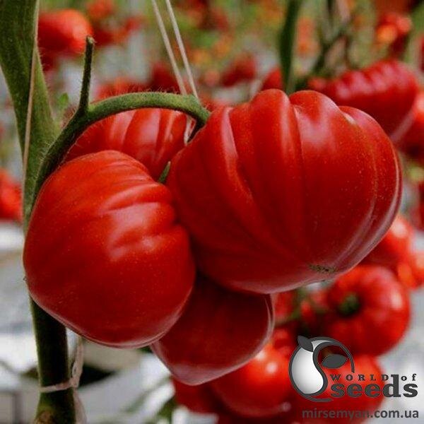 Продуктивний томат індетермінатного типу із раннім терміном дозрівання. Створений для всесезонного вирощування в плівкових теплицях. Опис: дозріває рослина протягом 60-65 діб. Гібрид характеризується великими плодами ребристої плескатої форми маленьким носиком. Маса помідора – 350 грам, але не рідкість та 600 грам. Дуже красиве червоне забарвлення. Щільні, стійкі до розтріскування. Неймовірно смачні, солодкі та соковиті. Томат наділений високими товарними властивостями за рахунок незвичайної форми і ваги. Рослина дуже потужна, з високою силою росту, генеративного типу. Дуже висока продуктивність, відмінна якість плодів.