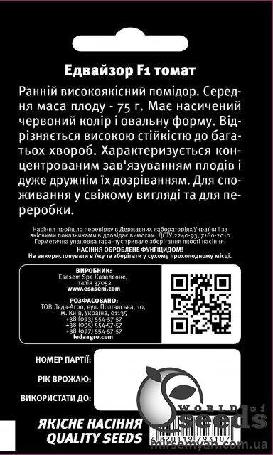 Едвайзор F1, Ранній високоякісний помідор. Середня маса плода – 75 г. Має насичений червоний колір та овальну форму. Відрізняється високою стійкістю до багатьох хвороб. Характеризується концентрованим зав'язуванням плодів та дуже дружнім їх дозріванням. Для споживання у свіжому вигляді та для переробки.