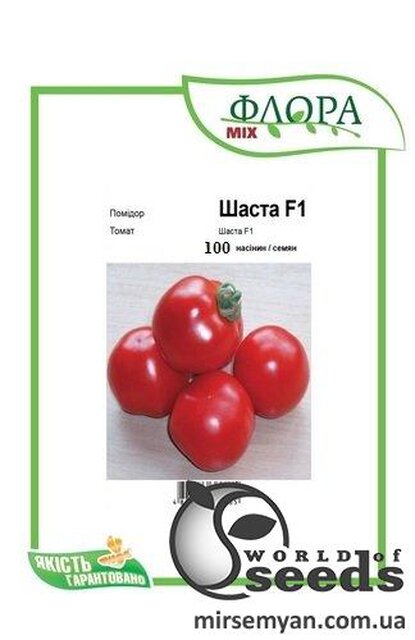 Томат Шаста F1 - найраніший у світі високопродуктивний детермінантний гібрид. При утворенні достатньої кількості кистей зріст зупиняється на рівні 80 см. Кущ потужний, кремезний, з великою кількістю зав'язей. Шаста F1 вимагає підв'язки до опори, вона просто потрібна у разі великої врожайності. Сорт ідеально підходить для вирощування на полях у промислових цілях. Листя велике, темно-зеленого кольору, суцвіття просте, плодоніжка має зчленування. Томат Шаста F1 має найкоротший період вегетації - від появи сходів до збору врожаю проходить лише 85-90 днів, тобто менше 3 місяців. Через раннє дозрівання Шасту F1 висівають прямо у відкритий ґрунт, не використовуючи розсадний спосіб.