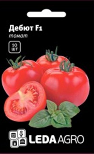Дебют (Debut) F1 - ранньостиглий гібрид великоплідного томату. Вегетаційний період становить 55-60 днів від висаджування розсади. Рекомендується для вирощування у відкритому ґрунті та під плівковими укриттями. Рослина детермінантна, добре облистнена. Аркуш середнього розміру, зелений. Суцвіття проміжного типу. Плодоніжка із зчленуванням. Плід плоско-округлий, слаборебристий, середньої щільності, забарвлення незрілого плоду світло-зелене, зрілого - червоне, середня маса 220-250 г, відмінні смакові якості. Гібрид стійкий до вертицилліозного в'янення та фузаріозу.