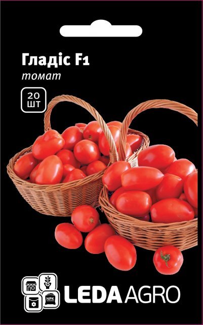 Гладіс F1, Середньостиглий, дуже продуктивний та високоврожайний гібрид. Рослина потужна, всі плоди добре вкриті, легко відокремлюються від плодоніжки. Плід перцевидної форми, розмір 85х45 мм, товщина стінки 8 мм, середня вага 75 г. За сприятливих умов на рослині формується більше 90 плодів, майже 90% дозрівають одночасно. Має високий вміст сухих речовин (більше 6,3%). Стійкий до основних захворювань томатів. Найкраще підходить для свіжого ринку та переробки.