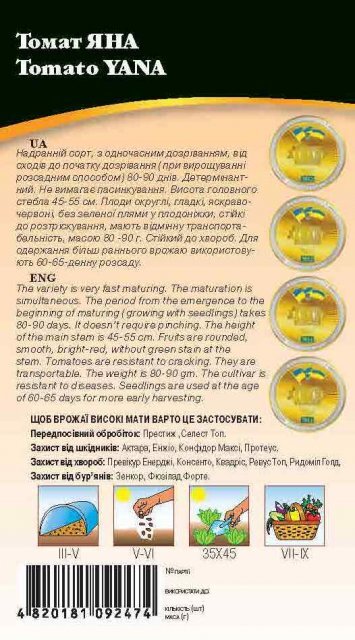 Насіння томату "Яна" Надранній сорт, з одночасним дозріванням, від сходів до початку дозрівання (при вирощуванні розсадним способом) 80-90 днів. Детермінантний. Не потребує пасинкування. Висота головного стебла 45-55 см. Плоди округлі, гладкі, яскраво-червоні, без зеленої плями у плодоніжки, стійкі до розтріскування, мають відмінну транспортабельність, масою 80-90 г. Стійкий до хвороб. Для отримання раннього врожаю використовують 60-65-денну розсаду.