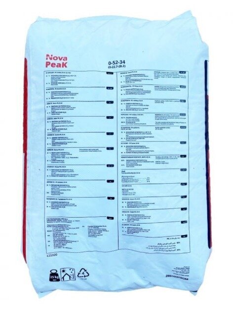 Рекомендована максимальна норма розчинення для приготування маточного розчину = 10-15 кг / 100 літрів води Переваги Монокалійфосфат Nova Peak 0-52-34 Добриво з найбільшою концентрацією фосфору.