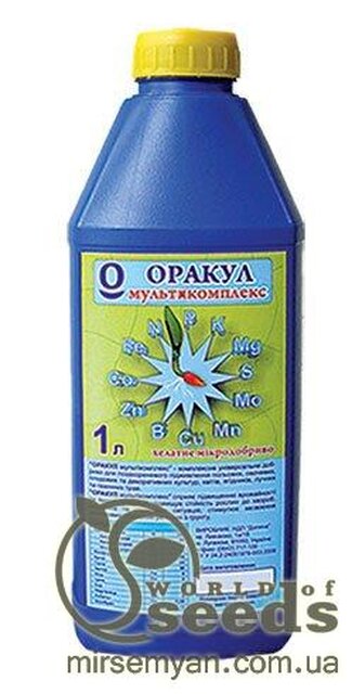 ОРАКУЛ® мультикомплекс – це комплексне універсальне рідке добриво для позакореневого підживлення польових, овочевих, плодових, ягідних, декоративних культур, лугових та газонних трав. Препарат забезпечує рослини основними поживними речовинами, необхідними для оптимального зростання та розвитку. До складу мікродобрива входять макро- та мікроелементи в хелатних та інших легкодоступних формах, що сприймаються рослинами як частина власної структури. Хелатуючим агентом виступає етидронова кислота, яка регулює рух води та зменшує утворення нерозчинних сполук у клітинах рослин. Вона створює високостійкі хелати з металами, а при їх розкладанні утворюються легкозасвоювані рослинами сполуки. Етидронова кислота – органічна сполука, до складу якої входить легкодоступний розчинний фосфор. Це виключає утворення водонерозчинних фосфатів металів. Азот у добриві представлений відновленими формами у вигляді аміду та амонію. Ці форми легко проникають крізь епідерміс клітини, затягуючи у себе інші елементи живлення, що у розчині. Залізо в препараті знаходиться у фізіологічно вивіреному співвідношенні Fe(II)/Fe(III), що дозволяє активізувати окисно-відновні перетворення. Застосовується разом із пестицидами, стимуляторами зростання, розчинами мінеральних добрив із широким інтервалом рН. Склад мікродобрива дозволяє проводити обробки при температурі повітря нижче +5 °С. Мікродобрива ОРАКУЛ® мультикомплекс містить пом'якшувач води, тому використання будь-яких пестицидів у жорсткій воді (підвищений вміст солей Ca2+ та Mg2+) разом із ОРАКУЛ® мультикомплекс не знижує їх ефективності. Солі жорсткості надійно зв'язуються компонентом препарату, не викликаючи помутніння робочого розчину; повністю ліквідується небезпека утворення сульфату кальцію (гіпсу), який може призвести до виходу з ладу обприскувачів. Обробки необхідно проводити розчином, підготовленим безпосередньо перед застосуванням. ОРАКУЛ® мультикомплекс має сильний фізіологічний вплив на рослини, який: компенсує нестачу поживних речовин у період несприятливих умов зростання, коли потреби рослин перевищують поглинаючу здатність кореневої системи; посилює засвоєння рослинами поживних речовин із ґрунту; підвищує стійкість рослин до хвороб та стресових ситуацій на 30%; сприяє підвищенню врожайності культур на 15-27% та покращує якість продукції.