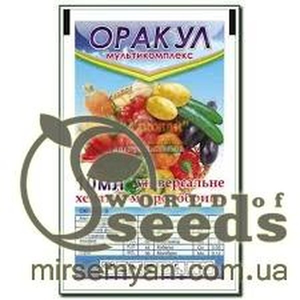 ОРАКУЛ® мультикомплекс – це комплексне універсальне рідке добриво для позакореневого підживлення польових, овочевих, плодових, ягідних, декоративних культур, лугових та газонних трав. Препарат забезпечує рослини основними поживними речовинами, необхідними для оптимального зростання та розвитку. До складу мікродобрива входять макро- та мікроелементи в хелатних та інших легкодоступних формах, що сприймаються рослинами як частина власної структури. Хелатуючим агентом виступає етидронова кислота, яка регулює рух води та зменшує утворення нерозчинних сполук у клітинах рослин. Вона створює високостійкі хелати з металами, а при їх розкладанні утворюються легкозасвоювані рослинами сполуки. Етидронова кислота – органічна сполука, до складу якої входить легкодоступний розчинний фосфор. Це виключає утворення водонерозчинних фосфатів металів. Азот у добриві представлений відновленими формами у вигляді аміду та амонію. Ці форми легко проникають крізь епідерміс клітини, затягуючи у себе інші елементи живлення, що у розчині. Залізо в препараті знаходиться у фізіологічно вивіреному співвідношенні Fe(II)/Fe(III), що дозволяє активізувати окисно-відновні перетворення. Застосовується разом із пестицидами, стимуляторами зростання, розчинами мінеральних добрив із широким інтервалом рН. Склад мікродобрива дозволяє проводити обробки при температурі повітря нижче +5 °С. Мікродобрива ОРАКУЛ® мультикомплекс містить пом'якшувач води, тому використання будь-яких пестицидів у жорсткій воді (підвищений вміст солей Ca2+ та Mg2+) разом із ОРАКУЛ® мультикомплекс не знижує їх ефективності. Солі жорсткості надійно зв'язуються компонентом препарату, не викликаючи помутніння робочого розчину; повністю ліквідується небезпека утворення сульфату кальцію (гіпсу), який може призвести до виходу з ладу обприскувачів. Обробки необхідно проводити розчином, підготовленим безпосередньо перед застосуванням. ОРАКУЛ® мультикомплекс має сильний фізіологічний вплив на рослини, який: компенсує нестачу поживних речовин у період несприятливих умов зростання, коли потреби рослин перевищують поглинаючу здатність кореневої системи; посилює засвоєння рослинами поживних речовин із ґрунту; підвищує стійкість рослин до хвороб та стресових ситуацій на 30%; сприяє підвищенню врожайності культур на 15-27% та покращує якість продукції.