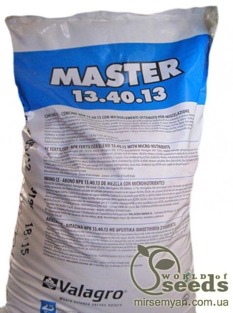Виробник: Valagro Cocтaв: загальний азот N – 13% (NO3 – 3,7%, NH4 – 9,3%), оксид фосфору – P2O5 – 40%, оксид калію K2O – 13%; мікроелемент: залізо Fe – 0,07%; марганець Mn – 0,03%; мідь Cu – 0,005%; цинк Zn – 0,01%; Бір B - 0,02%. Фізико-хімічний склад: pH (1% розчин) - 4.7 Розчинність, гл при 20o С - 42 ЕС, мСі/см (0,1% розчин) - 0.96 ПРИЗНАЧЕННЯ Master 13.40.13 - водорозчинне комплексне добриво з мікроелементами у формі хела призначений для підживлення широкого спектра культур на ранній стадії розвитку рослин, особливо на вологих або лужних грунтах. ОПИС Застосування добрива Майстер стимулює активне і тривале цвітіння, підвищує сопротивляемость хворобам, покращує пpиживаемість і Удобрення може бути використане в будь-якій системі поливу (крапельне зрошення, дощування і т.д.). МАЙСТЕР ефективний і простий у застосуванні. Вам тільки необхідно вибрати потрібне співвідношення N:P:K, оптимальне для даної сільськогосподарської культури та стадії розвитку рослин, та необхідну кількість добрив. Майстер це концентроване добриво з високим вмістом поживних речовин, яке точно збалансоване для різних стадій росту та особливостей ґрунту. Усі мікроелементи знаходяться у доступній для рослини (хелати EDTA – Cu, Fe, Mn, Zn) формі. Переваги: швидке зростання рослин завдяки безпосередньому поглинанню поживних речовин; рівномірне зростання завдяки низькій концентрації солей при фертигації; отримання ранньої та високоякісної продукції завдяки прискореному зростанню рослин та збалансованому співвідношенню N:P:K; відсутність хлорозів завдяки наявності магнію та мікроелементів у МАЙСТЕРі; контрольована щільність та розмір листя, форма та якість плодів. Спосіб застосування: Фертигація (крапельне зрошення, шланговий полив): 5-10 кг добрива на 1 га на добу. Листове підживлення: 0,200-0,40 кг на 100 л води. При краплинному поливі на 1000 м2: Томати – 0,4-0,6 кг/день протягом стадії вегетації та раннього цвітіння, починаючи зі стадії формування плода, ця норма повинна бути подвоєна; Огірки – 0,5-0,75 кг/день протягом стадії вегетації, починаючи зі стадії цвітіння 1,25 кг/день. Виноград – 0,4-0,6 кг/день протягом всієї вегетації; Троянди - 0,3-0,5 кг/день протягом всієї вегетації. Добриво подається з кожним надходженням води у всіх випадках. Як і Плантафол, Майстер можна використовувати і некореневим способом із концентрацією робочого розчину: овочі та квіти у теплицях – 0,1–0,2% розчином (1–2 кг/1000 л води); овочі у відкритому ґрунті 0,1–0,2% розчином (1–2 кг/1000 л води); садові культури – 0,25–0,5% розчином (2,5–5 кг/га); технічні (польові) культури – 0,5–0,75 % розчином (2,5–7,5 кг/га). Країна виробник: Італія