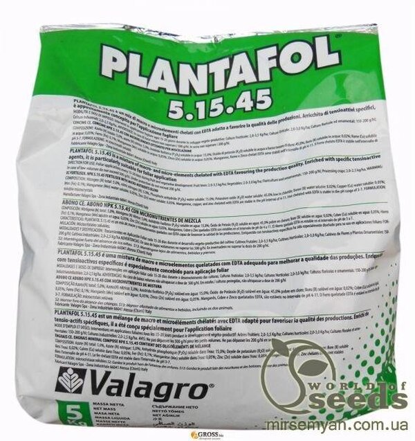 ПЛАНТАФОЛ 5:15:45 Високий вміст калію (45% у вигляді K2O) покращує вуглеводний обмін, процеси наливу та дозрівання, підвищує імунітет, стійкість до заморозків та посухи. Застосовуються для підвищення якісних характеристик на всіх культурах та/або у всіх ситуаціях, коли необхідно стимулювати вуглеводний обмін 5.15.45 Азота (N) всього 5,0 нітратний 5,0 аміачний-амідний- Фосфор (P2O5) 15,0 Калій (K2O) 45,0 Сірка (SO3) 12,0 Бор (B) 0,02 Залізо Fe (ЕДТА) 0,1 Марганець Mn (ЕДТА) 0,05 Цинк Zn (ЕДТА) 0,05 Мідь Cu (ЕДТА) 0,05 Водорозчинне комплексне добриво для листового підживлення Формула розроблена для застосування в більшості ситуацій, коли необхідно внести рівні дози поживних речовин та збалансувати харчування (на тлі азотних підживлень), що суттєво підвищує здатність засвоєння поживних речовин із основних добрив кореневою системою. Рекомендується вносити: - при зниженій активності кореневої системи; - при неефективній роботі кореневої системи внаслідок поганої аерації, низьких температур ґрунту, наявності патогенів; - при обмеженому надходженні поживних речовин у ґрунт; - за наявності лімітуючих факторів, таких як екстремальні рівні рН ґрунту, надмірна вологість або посушливість, низькі температури; - за необхідності швидко заповнити або запобігти дефіциту корисних речовин; - при слабкому розвитку кореневої системи, коли вона не здатна забезпечити рослину необхідними поживними речовинами у критичних стадіях зростання. Вибір типу Plantafol залежить від вегетативної стадії або дефіциту певного елемента - азоту, фосфору або калію. За допомогою листового підживлення Plantofol-ом можна заповнити потребу рослини в певних речовинах Норми внесення (некореневий спосіб): 250-300 г на 100 л води в умовах відкритого ґрунту. 150-200 г на 100 л води за умов закритого грунту. Інтервал між обробками 7-10 днів.