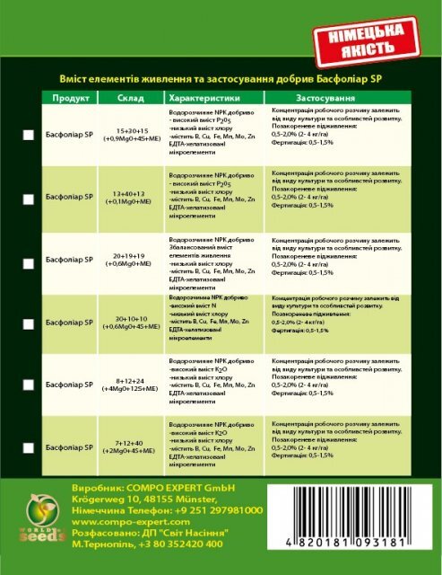 Compo Expert germany Упаковка Проф МініВид КристалічнийВиробник COMPO (Німеччина)Спосіб внесення Крапельний полив По листуПеріод внесення Цвітіння/буотонізація Зростання плодівБасфоліар "Basfoliar" 13-40-13+МЕ (1 кг)