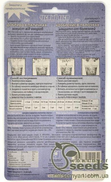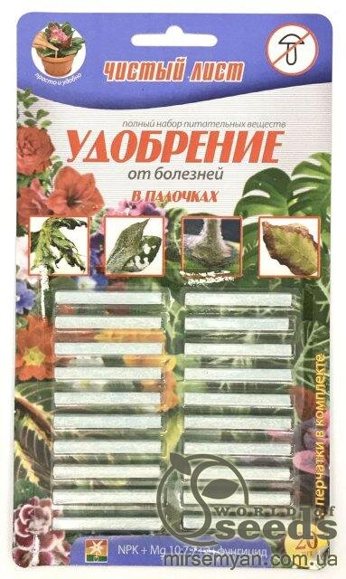 ЧИСТИЙ ЛИСТ У ПАЛОЧКАХ Комплексне мінеральне добриво тривалої дії від хвороб "Чистий Лист" в паличках, захистить надовго вашу рослину від таких хвороб як: борошниста роса, септоріоз, бура ржавчина, кор, і біла гнилизна, оідум, антракноз. Ви забудете на три місяці про проблеми пов'язані з хворобами рослин, а завдяки постійному впливу на рослину поживних речовин вони гармонійно розвиватимуться, при цьому підвищиться їхня опірність до хвороб. Добриво містить повноцінний набір макро та мікроелементів, основні з яких: азот-10%, фосфор-7%, калій-7%, магній-2%.