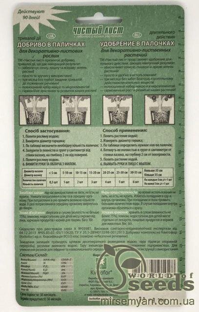 Чистий Лист для декоративно листяних 30 шт. (Kvitofor) Добриво тривалої дії, що дає найкращий результат. Три місяці без турбот про підживлення квітів завдяки тривалому забезпеченню рослини поживними речовинами. Повноцінний набір макро та мікроелементів. Гармонійне зростання та розвиток ваших рослин. Добриво містить поживні речовини: азот-12%, фосфор-6%, калій-8%, магній-2%