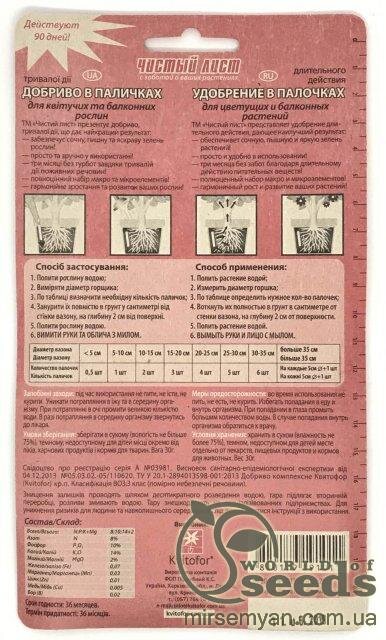 Чистий Лист Добриво в паличках для квітучих рослин Добриво тривалої дії, що дає найкращий результат. Три місяці без турбот про підживлення квітів завдяки тривалому забезпеченню рослини поживними речовинами. Повноцінний набір макро та мікроелементів. Гармонійне зростання та розвиток ваших рослин. Добриво містить поживні речовини: азот-8%, фосфор-10%, калій-14%, магній-2%. Полити рослину водою. Виміряти діаметр горщика, одягнути рукавички За таблицею визначити потрібну кількість паличок; Встромити їх повністю в ґрунт у сантиметрі від стінки вазону, на глибину 2 см. від поверхні. Полити рослину водою. Вимити руки та обличчя з милом. Уникати потрапляння в їжу та всередину організму. При попаданні у вічі промити великою кількістю води.