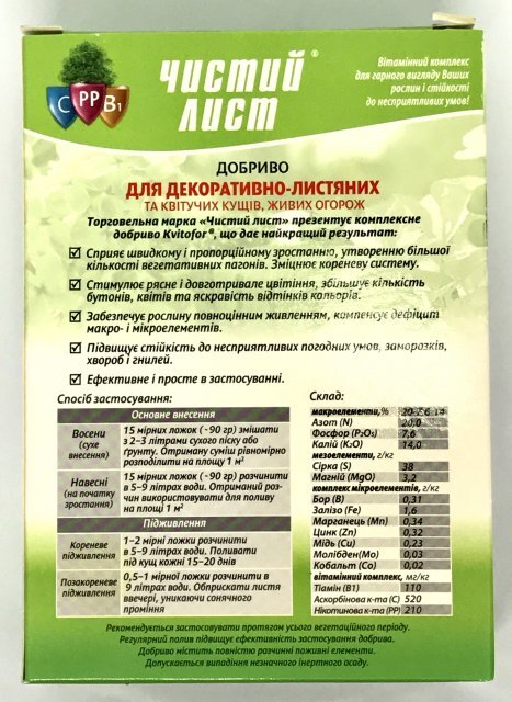 Склад: Макроелементи (%): всього N – 20, P205 – 7,6, K2О – 14; Мезоелементи (г/кг): S – 38, MgO – 3,2; Мікроелементи (г/кг): Бір (В) - 0,31, Залізо (Fe) - 1,6, Марганець (Мn) - 0,34, Цинк (Zn) - 0,32, Мідь (Cu) - 0, 23, Молібден (Мо) – 0,03, Кобальт (Со) – 0,02. Вітамінний комплекс (мг/кг): Тіамін (В1) – 110, Аскорбінова кислота (С) – 520, Нікотинова кислота (РР) – 210. Упаковки концентрату достатньо на 450 л. Кристалічне добриво для декоративних чагарників "Чистий Лист" Торгова марка "Чистий Лист" представляє ідеальне добриво, що дає найкращий результат: - висока якість плодів та квітів; рання та високоякісна продукція завдяки збалансованому складу NPK; - відсутність хлорозу завдяки наявності заліза та магнію; - Повна розчинність навіть у холодній воді; - компенсує дефіцит макро- та мікроелементів; - ефективність та простота застосування; - Сумісно з пестицидами та іншими добривами. Запобіжні заходи: Рекомендується виконувати роботи в рукавичках. При попаданні на шкіру промити водою з милом. Не допускати потрапляння в їжу та всередину організму. При попаданні у вічі промити великою кількістю води. При потраплянні в організм випити кілька склянок води, і викликати блювоту. Звернутися до лікаря. Рекомендації щодо зберігання: Зберігати у сухому, темному, недоступному для дітей місці окремо від ліків та харчових продуктів при t від -20 до +40°С. Термін придатності до споживання: 36 місяців. При попаданні у вічі промити великою кількістю води. При потраплянні в організм випити кілька склянок води, і викликати блювоту. Звернутися до лікаря. Рекомендації щодо зберігання: Зберігати у сухому, темному, недоступному для дітей місці окремо від ліків та харчових продуктів при t від -20 до +40°С. Термін придатності до споживання: 36 місяців. При попаданні у вічі промити великою кількістю води. При потраплянні в організм випити кілька склянок води, і викликати блювоту. Звернутися до лікаря. Рекомендації щодо зберігання: Зберігати у сухому, темному, недоступному для дітей місці окремо від ліків та харчових продуктів при t від -20 до +40°С. Термін придатності до споживання: 36 місяців.
