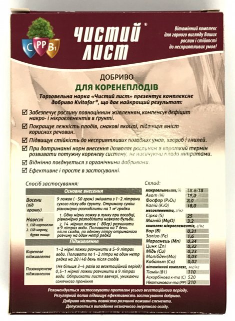 Добриво для коренеплодів Чистий Лист Макроелементи (%): всього N – 18, P205 – 8, K2О – 18; Мезо елементи (г/кг): S – 25, MgO – 3,2; Мікроелементи (г/кг): Бор (В) – 0,31, Залізо (Fe) – 1,6 Марганець (Мn) – 0,34, Цинк (Zn) – 0,32 Мідь (Cu) – 0,23, Молібден (Мо) – 0,03, Кобальт – (С) 0,02; Вітамінний комплекс (мг/кг): тіамін (В1) - 110, Аскорбінова кислота (С) - 520, нікотинова кислота (РР) - 210. Застосування продукції ТМ «ЧИСТИЙ ЛИСТ» - найкращий спосіб підтримки родючості ґрунту. Добриво забезпечує повноцінне харчування для рослин і може бути використане в будь-якій системі поливу (крапельне зрошення, дощування, гідропоніка і т.д.). врожаю у 1,5-2 рази. Підвищує врожайність, сприяє одночасному визріванню. Збільшує масу дозріваючих плодів та ягід. Покращує смакові якості плодів, підвищує вміст корисних речовин (вітамінів, білків, цукрів). Зменшує кількість псованих, опалих плодів і ягід, збільшує термін зберігання продукції. Підсилює відновлювальні здібності рослин. Торгова марка «Чистий Лист» представляє ідеальне добриво, що дає найкращий результат: - висока якість плодів та смакових якостей; - рання та високоякісна продукція завдяки збалансованому складу NPK; - відсутність хлорозу завдяки наявності заліза та магнію; - Повна розчинність навіть у холодній воді; - компенсує дефіцит макро- та мікроелементів; - ефективність та простота застосування; - Сумісно з пестицидами та іншими добривами. Рекомендується застосовувати протягом вегетаційного періоду. Регулярний полив збільшує ефективність застосування добрива. Запобіжні заходи: Рекомендується виконувати роботи в рукавичках. При попаданні на шкіру промити водою з милом. Не допускати потрапляння в їжу та всередину організму. При попаданні у вічі промити великою кількістю води. При потраплянні в організм випити кілька склянок води, і викликати блювоту. Звернутися до лікаря. Рекомендації щодо зберігання: Зберігати у сухому, темному, недоступному для дітей місці окремо від ліків та харчових продуктів при t від -20 до +40°С. Термін придатності до споживання: 36 місяців. При потраплянні в організм випити кілька склянок води, і викликати блювоту. Звернутися до лікаря. Рекомендації щодо зберігання: Зберігати у сухому, темному, недоступному для дітей місці окремо від ліків та харчових продуктів при t від -20 до +40°С. Термін придатності до споживання: 36 місяців. При потраплянні в організм випити кілька склянок води, і викликати блювоту. Звернутися до лікаря. Рекомендації щодо зберігання: Зберігати у сухому, темному, недоступному для дітей місці окремо від ліків та харчових продуктів при t від -20 до +40°С. Термін придатності до споживання: 36 місяців.