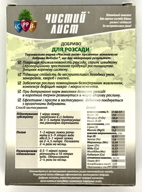 Добриво кристалічне "Чистий Лист" для розсади 300 г. (Kvitofor) Макроелементи (%): всього N - 7, P205 - 30, K2О - 17; Мезоелементи (г/кг): S – 58,1, MgO – 3,2; Мікроелементи (г/кг): Бір (В) - 0,31, Залізо (Fe) - 1,6, Марганець (Мn) - 0,34, Цинк (Zn) - 0,32, Мідь (Cu) - 0, 23, Молібден (Мо) – 0,03, Кобальт (Со) – 0,02. Вітамінний комплекс (мг/кг): Тіамін (В1) – 110, Аскорбінова кислота (С) – 520, Нікотинова кислота (РР) – 210. Упаковки концентрату достатньо на 450 л. Кристалічне добриво для розсади "Чистий Лист" Торгова марка "Чистий Лист" представляє ідеальне добриво, що дає найкращий результат: - Висока якість плодів. - рання та високоякісна продукція завдяки збалансованому складу NPK; - відсутність хлорозу завдяки наявності заліза та магнію; - Повна розчинність навіть у холодній воді; - компенсує дефіцит макро- та мікроелементів; - ефективність та простота застосування; - Сумісно з пестицидами та іншими добривами. Застосування продукції ТМ «ЧИСТИЙ ЛИСТ» - найкращий спосіб підтримки родючості ґрунту. Добриво забезпечує повноцінне харчування для рослин і може бути використане в будь-якій системі поливу (крапельне зрошення, дощування, гідропоніка і т.д.). врожаю у 1,5-2 рази. Запобіжні заходи: Рекомендується виконувати роботи в рукавичках. При попаданні на шкіру промити водою з милом. Не допускати потрапляння в їжу та всередину організму. При попаданні у вічі промити великою кількістю води. При потраплянні в організм випити кілька склянок води, і викликати блювоту. Звернутися до лікаря. Рекомендації щодо зберігання: Зберігати у сухому, темному, недоступному для дітей місці окремо від ліків та харчових продуктів при t від -20 до +40°С. Термін придатності до споживання: 36 місяців.