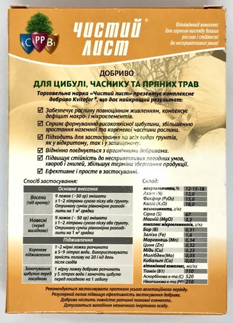Добриво кристалічне "Чистий Лист" для цибулі, часнику та пряних трав 300 г. (Kvitofor) Макроелементи (%): всього N - 12, P205 - 15, K2О - 18; Мезо елементи (г/кг): S – 67, MgO – 3,2; Мікроелементи (г/кг): Бір (В) - 0,31, Залізо (Fe) - 1,6, Марганець (Мn) - 0,34, Цинк (Zn) - 0,32, Мідь (Cu) - 0, 23, Молібден (Мо) – 0,03, Кобальт (Со) – 0,02; Вітаміни (мг/кг): Тіамін (В1) – 110, Аскорбінова кислота (С) – 520, Нікотинова кислота (РР) – 210. Упаковки концентрату достатньо на 450 л води. Рекомендується застосовувати протягом вегетаційного періоду. Регулярний полив збільшує ефективність застосування добрива. Всі поживні елементи, що містяться в добривах, повністю розчинні. Застосування продукції ТМ «ЧИСТИЙ ЛИСТ» - найкращий спосіб підтримки родючості ґрунту. Добриво забезпечує повноцінне харчування для рослин і може бути використане в будь-якій системі поливу (крапельне зрошення, дощування, гідропоніка тощо) Запобіжні заходи: Рекомендується виконувати роботи в рукавичках. При попаданні на шкіру промити водою з милом. Не допускати потрапляння в їжу та всередину організму. При попаданні у вічі промити великою кількістю води. При потраплянні в організм випити кілька склянок води, і викликати блювоту. Звернутися до лікаря. Рекомендації щодо зберігання: Зберігати у сухому, темному, недоступному для дітей місці окремо від ліків та харчових продуктів при t від -20 до +40°С. Термін придатності до споживання: 36 місяців. Не допускати потрапляння в їжу та всередину організму. При попаданні у вічі промити великою кількістю води. При потраплянні в організм випити кілька склянок води, і викликати блювоту. Звернутися до лікаря. Рекомендації щодо зберігання: Зберігати у сухому, темному, недоступному для дітей місці окремо від ліків та харчових продуктів при t від -20 до +40°С. Термін придатності до споживання: 36 місяців. Не допускати потрапляння в їжу та всередину організму. При попаданні у вічі промити великою кількістю води. При потраплянні в організм випити кілька склянок води, і викликати блювоту. Звернутися до лікаря. Рекомендації щодо зберігання: Зберігати у сухому, темному, недоступному для дітей місці окремо від ліків та харчових продуктів при t від -20 до +40°С. Термін придатності до споживання: 36 місяців.