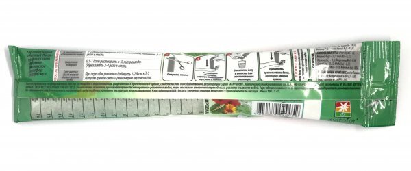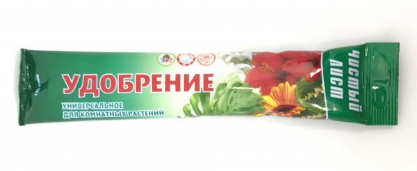 Добриво кристалічне "Чистий Лист" універсальне для кімнатних квітів 100 г. (Kvitofor) Макроелементи (%): всього N - 18, P205 - 11, K2О - 15; Мезоелементи (г/кг): S – 46, MgO – 3,2; Мікроелементи (г/кг): Бір (В) - 0,31, Залізо (Fe) - 1,6, Марганець (Мn) - 0,34, Цинк (Zn) - 0,32, Мідь (Cu) - 0, 23, Молібден (Мо) – 0,03, Кобальт (Со) – 0,02. Вітаміни (мг/кг): Тіамін (В1) 110, Аскорбінова кислота (С) 520, Нікотинова кислота (РР) 210. Застосування продукції ТМ «ЧИСТИЙ ЛИСТ» - найкращий спосіб підтримки родючості ґрунту. Добриво забезпечує повноцінне харчування для рослин і може бути використане в будь-якій системі поливу (крапельне зрошення, дощування, гідропоніка і т.д.). що призводить до збільшення врожаю в 1,5-2 рази. Торгова марка «Чистий Лист» представляє ідеальне добриво, що дає найкращий результат: - висока якість плодів та квітів; - рання та високоякісна продукція завдяки збалансованому складу NPK; - відсутність хлорозу завдяки наявності заліза та магнію; - Повна розчинність навіть у холодній воді; - компенсує дефіцит макро- та мікроелементів; - ефективність та простота застосування; - Сумісно з пестицидами та іншими добривами. Запобіжні заходи: Рекомендується виконувати роботи в рукавичках. При попаданні на шкіру промити водою з милом. Не допускати потрапляння в їжу та всередину організму. При попаданні у вічі промити великою кількістю води. При потраплянні в організм випити кілька склянок води, і викликати блювоту. Звернутися до лікаря. Рекомендації щодо зберігання: Зберігати у сухому, темному, не доступному для дітей місці окремо від ліків та харчових продуктів при t від -20 до +40 °С. Термін придатності до споживання: 36 місяців.