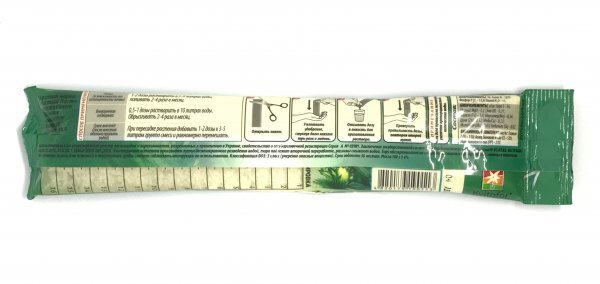 Добриво кристалічне "Чистий Лист" для декоративно-листяних рослин 100 г. (Kvitofor) Макроелементи (%): всього N - 19, P205 - 13, K2О - 11; Мезоелементи (г/кг): S – 36, MgO – 3,2; Мікроелементи (г/кг): Бір (В) - 0,31, Залізо (Fe) - 1,6, Марганець (Мn) - 0,34, Цинк (Zn) - 0,32, Мідь (Cu) - 0, 23, Молібден (Мо) – 0,03, Кобальт (Со) – 0,02. Вітаміни (мг/кг): Тіамін (В1) 110, Аскорбінова кислота (С) 520, Нікотинова кислота (РР) 210. Торгова марка «Чистий Лист» представляє ідеальне мінерально-комплексне добрива, що дає найкращий результат: - висока якість плодів та квітів; - рання та високоякісна продукція завдяки збалансованому складу NPK; - відсутність хлорозу завдяки наявності заліза та магнію; - Повна розчинність навіть у холодній воді; - компенсує дефіцит макро- та мікроелементів; - ефективність та простота застосування; - Сумісно з пестицидами та іншими добривами. Застосування продукції ТМ «ЧИСТИЙ ЛИСТ» - найкращий спосіб підтримки родючості ґрунту. Добриво забезпечує повноцінне харчування для рослин і може бути використане в будь-якій системі поливу (крапельне зрошення, дощування, гідропоніка і т.д.). врожаю у 1,5-2 рази. Запобіжні заходи: Рекомендується виконувати роботи в рукавичках. При попаданні на шкіру промити водою з милом. Не допускати потрапляння в їжу та всередину організму. При попаданні у вічі промити великою кількістю води. При потраплянні в організм випити кілька склянок води, і викликати блювоту. Звернутися до лікаря. Рекомендації щодо зберігання: Зберігати у сухому, темному, недоступному для дітей місці окремо від ліків та харчових продуктів при t від -20 до +40 °С. Термін придатності до споживання: 36 місяців.
