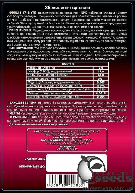 Фініш NPK 8-17-41 Комплексне водорозчинне NPK - добриво з високим вмістом фосфору та кальцію. Спеціально розроблене для збалансованого харчування рослин під час стадій цвітіння, зав'язування, наливу та дозрівання плодів, утворення коренів та бульб. Збільшує врожай та його якість. Призначення: для кореневого підживлення. Знижує симптоми стресу та захищає рослину від негативних факторів навколишнього середовища. А також для усунення дефіциту кальцію. Є повністю розчинним. Завдяки низькому pH очищає крапельниці поливної системи та забезпечує доступність елементам живлення. Застосування. 25 г розчинити в 10 л води і цим розчином полити рослину безпосередньо в підкорене зону. Овочеві, квіткові, ягідні, кімнатні культури, дерева та чагарники – кожні 2-7 днів. Підгодовувати рослини вранці чи ввечері.