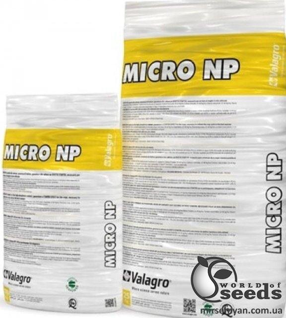Micro NP (гранули), 25 кг – універсальне азотно-фосфорне добриво у вигляді гранул із ефектом «стартера». Є джерелом елементів живлення та фітогормонів, необхідних для потужного та здорового початку зростання сільськогосподарських культур. Біостимулятор має гарний ефект при внесенні на столові та цукрові буряки, цибулю, томати, соняшник, кукурудзу, технічні та садові культури. Його внесення за допомогою високоточних сівалок значно знижує витрати НПК добрив. Стартове добриво забезпечує рослини поживними елементами на початкових стадіях вегетації, сприяє укоріненню розсади, у складі міститься фосфор – неодмінний елемент для ефективного розвитку, вноситься безпосередньо в кореневу зону. Значними перевагами комплексу Micro NP є: Рівномірність внесення та розподілу по всій посівній площі (за допомогою сівалки з аплікаторами); У разі надмірно вологого ґрунту, добриво не пригнічує зростання та розвитку рослин; У складі містяться біостимулятори та цинк у хелатній формі; Внесення добрив значно покращує імунітет культур, одночасно пригнічує бур'яни. Хімічний склад Азот (NH4-N) – 4%; Фосфор (P2O5) – 30%; Цинк (Zn (хелат EDTA)) – 1%; Органічний стимулятор, укорінювач – 2,5%