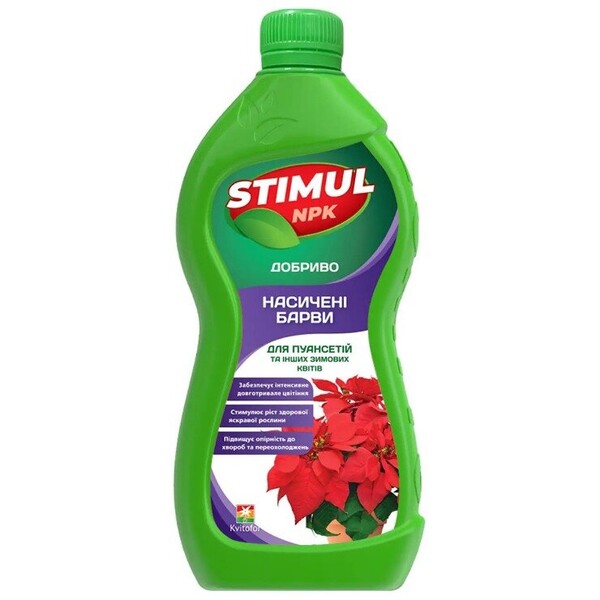 Комплексне мінеральне добриво Стимул застосовується для підживлення всіх сортів пуасентій та інших рослин, що квітнуть у зимовий період. Дане добриво містить у складі: азот (N) - 15 г/л, фосфор (P) - 20 г/л, калій (К) - 40 г/л, а також комплекс мікроелементів та вітамінів, необхідних для повноцінного росту та розвитку рослин. Збалансований збагачений склад добрива Стимул містить усі необхідні для живлення елементи в оптимальному співвідношенні та легкодоступній для рослин формі, завдяки чому засіб стимулює інтенсивне тривале цвітіння, та підвищує декоративні якості рослин, зміцнює імунітет квіткових культур, а також усуває видимі прояви дефіциту елементів живлення. Мінеральне підживлення стимул ефективно використовується для захисту, азалій, фіалок, пуасентій, орхідей, гіпоаструму, цикламену, гузманії та інших зимових квіткових культур.