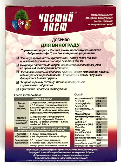 Склад: Макроелементи (%): всього N – 21, P205 – 8, K2О – 13; Мезо елементи (г/кг): S – 24 MgO – 3,0; Мікроелементи (г/кг): Бір (В) - 0,31, Залізо (Fe) 1,60, Марганець (Мn) 0,34, Цинк (Zn) 0,32, Мідь (Cu) 0,23, Молібден ( Мо) 0,03, Кобальт (З) 0,02; Вітаміни (мг/кг): Тіамін (В1) - 110, Аскорбінова кислота (С) - 520, Нікотинова кислота (РР) - 210. Кристалічне добриво для винограду "Чистий Лист" результат: - Висока якість плодів. - рання та високоякісна продукція завдяки збалансованому складу NPK; - відсутність хлорозу завдяки наявності заліза та магнію; - Повна розчинність навіть у холодній воді; - компенсує дефіцит макро- та мікроелементів; - ефективність та простота застосування; - Сумісно з пестицидами та іншими добривами. Добриво збільшує врожайність, цукристість, розмір грона та ягід, прискорює дозрівання, зменшує обсипання зав'язі; Поліпшується опірність до хвороб, несприятливих погодних умов та стресів від застосування гербіцидів; Закладається більше плодових бруньок, краще визрівають пагони, покращується морозостійкість. У зимуючих очах та нирках формується більше суцвіть; Зміцнює кореневу систему. Добре поєднується з органічними добривами; Ефективно та просто у застосуванні. Зміцнює кореневу систему. Добре поєднується з органічними добривами; Ефективно та просто у застосуванні. Зміцнює кореневу систему. Добре поєднується з органічними добривами; Ефективно та просто у застосуванні.