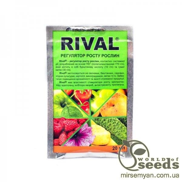 Регулятор росту рослин, контактно-системної дії, розроблений на основі поліетиленгліколей (770 г/л), з вмістом бурштинової кислоти (10 г/л) та гумату калію (30 г/л). Препарат Rival® має такі властивості: 1. Стимулятор росту – за рахунок посилення обмінних процесів у рослинній клітині, викликаних дією препарату, посилюється надходження елементів живлення до рослин. 2. Кріопротектор та адаптоген – поліетиленгліколі знижують температуру замерзання клітинного соку в рослинах, а також підвищують кількість цукрів у вузлах кущіння рослин. 3. Прилипач – ПЕГ мають високу плівкоутворювальну здатність, завдяки якій забезпечується закріплення бакових препаратів на поверхні насіння та листя, що підвищує ефективність ЗЗР та мікродобрив. 4. Інгібітор хвороб - поліетиленоксиди мають здатність зневоднення бактерій і грибків, за рахунок чого знижується уражуваність рослин хворобами на 20-30%. 5. Антистресант – низькомолекулярні ПЕГ, поряд з гуматами та янтарною кислотою, прискорюють обмінні процеси у тканинах рослин, що проявляється в інтенсивному синтезі антистресових речовин, та відповідно знімає фітотоксичність після обробки пестицидами.