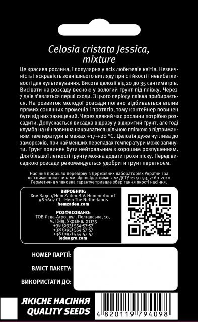 Целозія Джесіка, гребінчаста суміш (Celosia cristata Jessica, mixture) - це красива рослина, та популярна у всіх любителів квітів. Незвичайність та яскравість зовнішнього вигляду при стійкості та невибагливості для культивування. Висота цілозії від 20 до 35 сантиметрів. Висівати на розсаду навесні у вологий ґрунт під плівку. Через 7 днів з'являться перші сходи. З цього періоду плівка забирається. На розвиток молодої розсади погано відбивається вплив прямого сонячного проміння і протягів, тому контейнер повинен бути від них захищений. Через деякий час рослини слід розсадити. Допускається висаджування відразу у відкритий ґрунт, але тоді клумба на ніч повинна накриватися щільною плівкою з підтримкою температури +17-20 °C. Целозія дуже чутлива до заморозків, за найменших перепадів температури може загинути. Грунт повинен бути нейтральним з гарним розпушенням. Для більшої легкості ґрунту можна додати трохи піску. Перед висадкою розсади рекомендується удобрити ґрунт перегноєм.