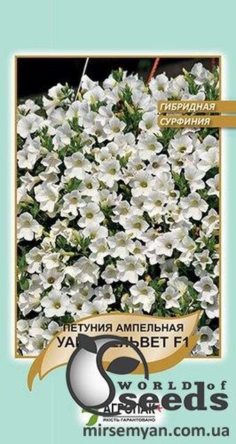 У петунії "Уайт Вельвет F1" квітки білого забарвлення, середнього розміру 5,5-6 см. Рослина характеризується стійкістю до шкідників та хвороб, а також високою схожістю насіння. З успіхом використовується там, де підкреслюється її каскадний характер (у кашпо, підвісних кошиках та для оформлення). Довжиною своїх чудових втеч, що звисають, досягають 100 см, вона може сміливо конкурувати з сортами, що розмножуються вегетативно. Через короткий період часу рослини зростаються, і утворюють килим квіток заввишки 25 см. Регулярні підживлення позитивно впливають на довжину пагонів. При посіві насіння землею не закладають, ємність прикривають плівкою і ставлять у тепле освітлене місце. Сходи з'являються через 4-6 днів за нормальної температури 24-25оС. У цей період дуже важливо підтримувати постійну вологість ґрунту, пересихання уповільнює процес проростання, і так само прибирати конденсат із плівки. Після проростання сіянці утримують при температурі 17-18оС. У фазі двох справжніх листків, сіянці пікірують. Розсаду гартують. Коли мине загроза весняних заморозків, розсаду висаджують на постійне місце, витримуючи відстань між рослинами 15-20см. Полив помірний. Підживлення повним мінеральним добривом, розпушування ґрунту, прополювання сприяють кращому зростанню та цвітінню. Для продовження цвітіння відцвілі квіти відщипують. прополка сприяють кращому зростанню та цвітінню. Для продовження цвітіння відцвілі квіти відщипують. прополка сприяють кращому зростанню та цвітінню. Для продовження цвітіння відцвілі квіти відщипують.
