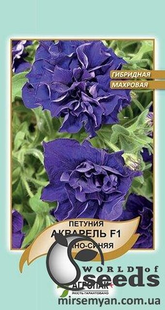 Петунія гібридна махрова „Акварель” – однорічна рослина з напівзвисаючими стеблами, квітки махрові різного забарвлення. Віддає перевагу легким, родючим, нейтральним, добре дренованим без застою води грунту і сонячному місці. Рясне цвітіння з червня до заморозків. Ідеальна для оздоблення балконів, оформлення бордюрів, створення композицій на клумбах. Насіння-драже у мікропробірці.