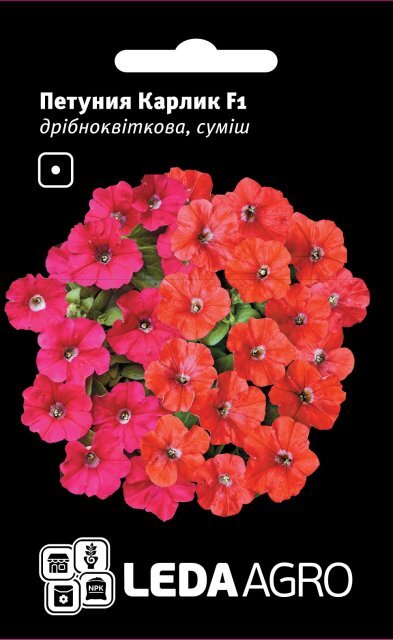 Серія Карлик F1 дуже ранній сорт. На рослині завжди зацвітає відразу кілька квітів. Цей сорт петунії утворює особливо гіллястий компактний кущик. Рослини призначені, перш за все, для посадок у квіткові горщики, але з успіхом їх можна використовувати і для посадки в квітники. Кущики петунії досягають висоти 20 см. Характерна висока стійкість гібридів. Вони рясно цвітуть протягом усього сезону. Діаметр кольорів 4-5 см. Увага: насіння у гранулах! Не допускайте пересихання гранули. Сіянці вимагають обприскування, пікірування у фазі 2-х справжніх листків. Петунію поливають з інтервалом 7-10 днів, починаючи через тиждень після висадки розсади. Полив проводити помірний.