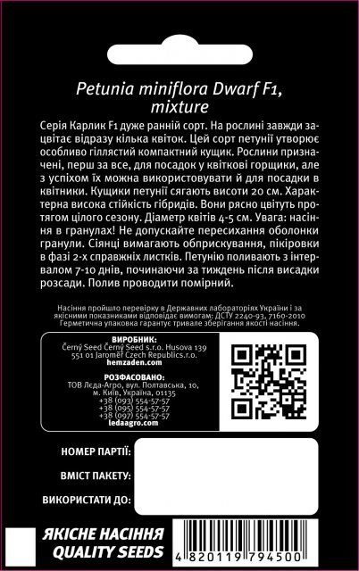 10 Cherny Упаковка МініТермін дозрівання РаннійВиробник Cherny (Чехія)Петунія Карлик. суміш 10 семена L (Cherny Чехія)